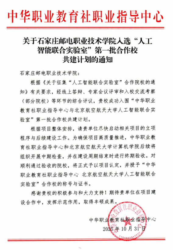 近日,中华职业教育社职业指导中心联合北京航空航天大学(以下简称“北航”),启动面向全国职业院校的“人工智能联合实验室”合作院校征集,经线上答辩、专家会议评审及入校交流考察等多环节综合评议,学院成功入选“中华职业教育社职业指导中心与北京航...