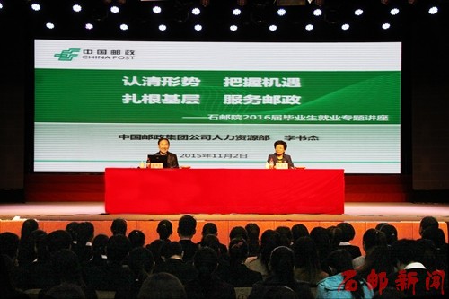 (信息来源:学生处、团委) 在2016届毕业生邮政企业双选会召开之即,2015年11月2日,学院特邀中国邮政集团公司人力资源部副总经理李书杰来我院为2016届毕业生作就业指导专题报告,报告会分两场分别在学院东、西校区学术会堂举行。...