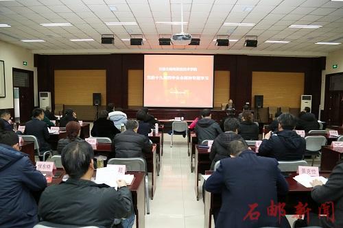 根据集团公司党组和河北省委统一部署要求,按照学院学习宣传贯彻十九届四中全会精神集中培训安排,11月28日上午,学院领导、全体中层干部和机关各部门全体党员80余人通过视频学习方式学习中央宣讲团在河北省宣讲党的十九大精神报告会内容。...