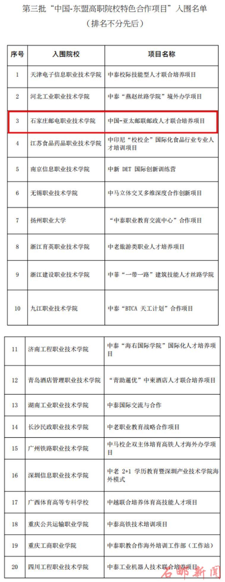日前,中国教育国际交流协会秘书处(教育部直属单位)公布了第三批“中国—东盟高职院校特色合作项目”名单,学院申报的“中国-亚太邮联邮政人才联合培养项目”成功入选。 多年来,学院与亚太邮政学院在邮政人才联合培养、...