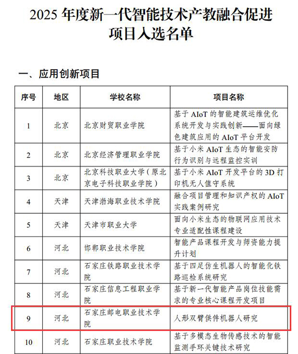 日前,教育部职业教育发展中心发布《2025年度新一代智能技术产教融合促进项目入选名单的通知》,智能工程学院吴蓬勃教授主持申报的应用创新项目《人形双臂供件机器人研究》成功入选。 新一代智能技术产教融合促进项目,...
