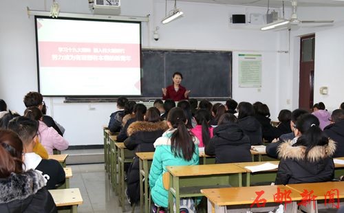 郎秋洪围绕“党的十九大精神内涵解析、新时代中国邮政的新发展、做有理想有本领的新青年”三方面展开论述。首先,从准确把握十九大精神的思想精髓和核心要义切入,带领同学们梳理了十九大报告的主题、逻辑及核心内容,重点对十九大报告中“新时代”“新思想”“新征程”三大关键词做了深入解读;接下来,她结合国企改革新要求、中国邮政新发展、邮政金融发展史,详细介绍了中国邮政的发展历史与企业文化,中国邮政金融体系和邮储银行发展成就以及石邮学院的发展定位与使命职责;最后,她从有担当、有理想、有作为三个层次对同学们提出了要求,勉励同学们要珍惜美好年华,充实知识储备,修炼专业技能,提升综合素质,努力成为有理想、有本领的优秀青年,作出无愧于时代、无愧于青春的光辉业绩。清晰的思路、翔实的数据、平实的语言……郎秋洪循循善诱,谆谆教导;同学们全神贯注、津津有味。