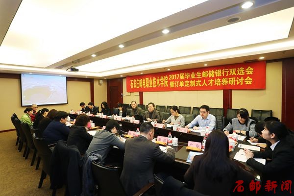2016年11月28日,学院召开2017届毕业生邮储银行双选会暨订单定制式人才培养研讨会。中国邮政储蓄银行人力资源部员工管理处处长李小东,学院副院长赵栓亮,以及14个省(区、市)邮储分行和信用卡中心、95580客服中心2个总行直属单位共16家单位24位代表,以及学院相关职能部门、系部的领导参加了研讨会。研讨会由赵栓亮主持。