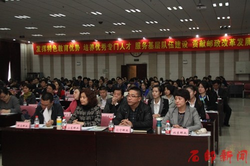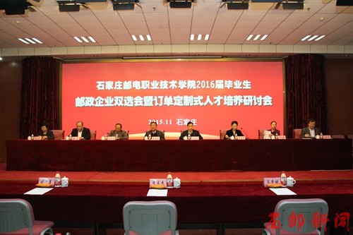 2015年11月3日,学院召开2016届毕业生邮政企业双选会暨订单定制式人才培养研讨会。中国邮政集团公司人力资源部副总经理李书杰,河北省教育厅学生处马贵明,集团公司人力资源部教育培训处经理魏东,邮政速递物流公司总部人力资源部教育培训处处长卢云霞,学院党委书记田克美、院长郎秋洪、党委副书记周爱莲、副院长赵栓亮,以及31个省(区、市)邮政公司和中邮人寿保险股份有限公司、集团公司邮票印制局,29个省速递物流公司和中国邮政速递物流股份有限公司南京集散中心,10个地市邮政分公司人力资源部领导出席了研讨会,学院各职能部门、系部的领导,专业建设负责人、辅导员和师生代表参加了研讨会。大会由魏东主持。