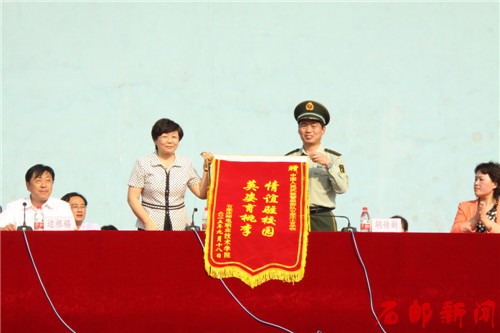 学生处处长鲍增军代表学院宣读了对军训先进集体和个人的表彰决定,主席台领导向先进集体、先进个人代表、优秀宿舍代表颁发了锦旗和证书。周爱莲代表学院向武警石家庄士官学校赠送了绣有“英姿育桃李,情谊驻校园”的锦旗。