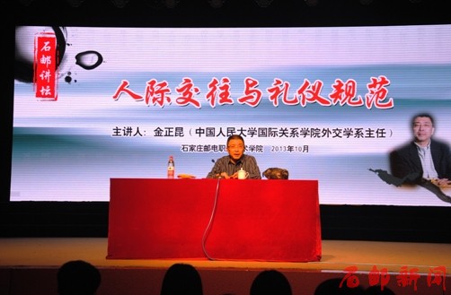 10月22日,中国著名礼仪专家、中央电视台百家讲坛礼仪课程主讲、中国人民大学国际关系学院外交学系主任金正昆教授应邀来到我院,在学院学术礼堂为学院师生献上了一场精彩的“人际交往与礼仪规范”专题讲座。学院1000多名师生聆听了讲座,整场讲座座无虚席,现场氛围轻松愉快,金正昆教授以幽默诙谐、富有哲理的语言,从举止礼仪、仪态礼仪、仪表礼仪、日常见面礼仪、常用礼仪等方面,深入浅出地讲解了人际交往的艺术和有效沟通的方法。