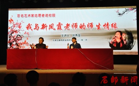 11月14日,河北省“百名艺术家进校园”活动再次走进石邮,国家一级演员,著名评剧表演艺术家,赢得“国宝再现”、“小新凤霞”等赞誉的刘秀荣老师应邀来到学院,在本部学术礼堂为石邮师生讲述了“我与新凤霞老师的师生情缘”,同行的还有石家庄市评剧院青年评剧团国家一级演员靳玲展老师。两位艺术家深情的讲述和精湛的表演为广大师生带来了一场视觉与听觉的盛宴,赢得了师生们的阵阵掌声。