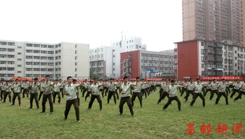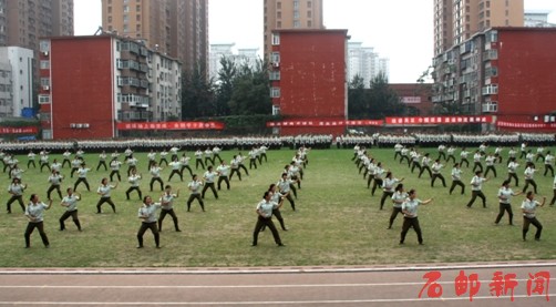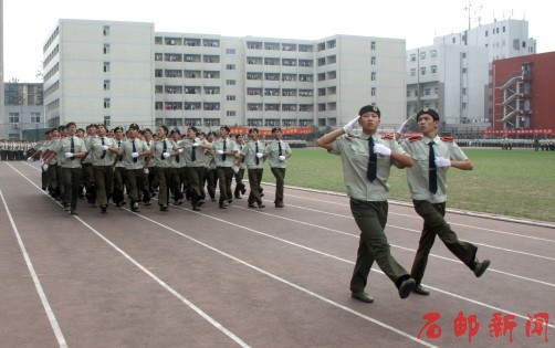 下午3点整,2013级新生军训汇报暨开学典礼在庄严的国歌声中拉开帷幕。在田克美下达“开始”指令后,伴随着雄壮的解放军进行曲,军训汇报表演正式开始。分列式上,学院2013级40个新生方队,在校旗护卫队的引导下,迈着整齐的步伐,高呼嘹亮的口号,精神抖数地通过主席台接受检阅。他们队形整齐、精神饱满、意气风发,展现了大学生朝气蓬勃的风采,赢得了广大师生的热烈掌声。分列式后,进行了擒敌拳和军体拳团体项目表演,同学们以严明的纪律、过硬的素质和标准的动作,汇报了他们优秀的训练成果,展现了石邮学子良好的精神风貌。