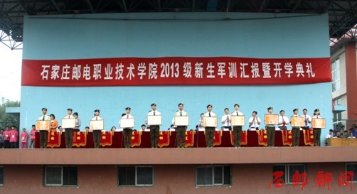 学生处处长周雪峰代表学院宣读了对军训先进集体和个人的表彰决定,主席台领导向先进集体、先进个人、优胜宿舍代表颁发了锦旗和证书。田克美代表学院向承训部队―河北省军区教导大队赠送了绣有“谱国防教育新篇,育邮电通信人才”的锦旗。
