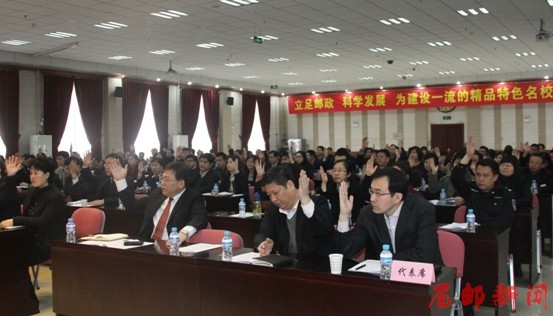 上午8时30分,会议在雄伟的国歌声中开幕。赵双占代表学院党委和行政作了题为《立足邮政 科学发展 为建设一流精品特色名校而努力奋斗》的工作报告。报告分三部分,一是2012年主要工作回顾;二是继承和发扬学院的优良传统和办学经验;三是2013年主要工作任务。
