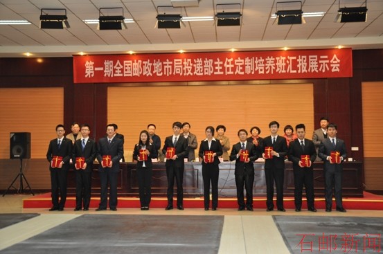 第一期地市局投递部主任定制生在会上向集团公司、定制企业领导汇报了定制培养过程中的收获、体会、感悟,并展示了晨会、数报、排信、盖戳四项技能。他们饱满的精神状态、熟练的业务技能得到了各位与会领导的一致好评。会上,各位领导向定制培养生颁发了定制培养结业证书。