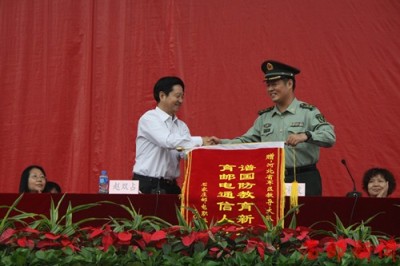 学生处处长周雪峰代表学院宣读了对军训先进集体和个人的表彰决定,主席台领导向先进集体、先进个人、优胜宿舍代表颁发了锦旗和证书。赵双占代表学院向承训部队―河北省军区教导大队赠送了绣有“谱国防教育新篇,育邮电通信人才”的锦旗。