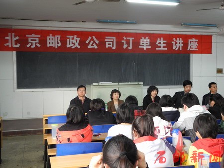 2012年3月31日,北京市邮政公司订单生讲座在学院举办,这是为帮助订单生进一步了解企业、提升职业能力,学院教务处和北京市邮政公司人力资源部共同策划举办的系列讲座之一。北京市邮政公司人力资源部曹立冬老师、电子商务局赵蓉副局长、衣功局长助理、报刊发行局市场部王华明主任参加了讲座活动,学院2010、2011级的150余名北京订单生听取了讲座。讲座由教务处叶红英副处长主持。