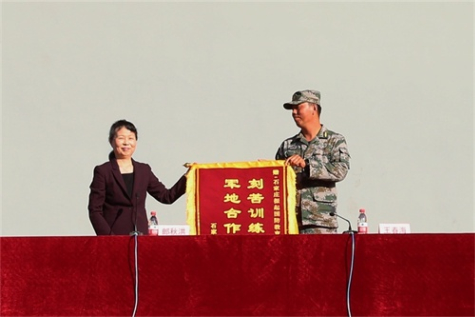 郎秋洪代表学院向承训单位赠送了绣有“刻苦训练结硕果,军地合作开新花”的锦旗。