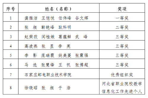 近日,河北省教育厅发布了《河北省教育厅关于公布2020年河北省职业院校技能大赛教学能力比赛结果的通知》(冀教职成函〔2020〕29号),学院在此项比赛中荣获一等奖1项、二等奖1项、三等奖4项,学院荣获“优秀组织奖”,学院3名同志获“河北省职业院校教学信息化工作先进个人”。