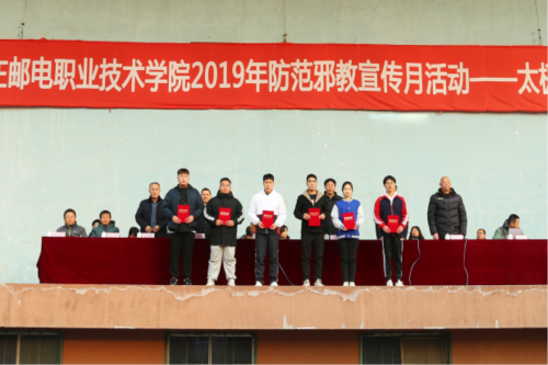 12月12日,学院举办2019年防范邪教宣传月活动之太极拳大赛。学院党委书记郎秋洪、纪委书记郑奎新、安保处处长吴岩峰、学生处处长鲍增军、基础部主任景克俭出席了比赛。比赛评委由基础部专业老师、各系部书记、教师代表组成。