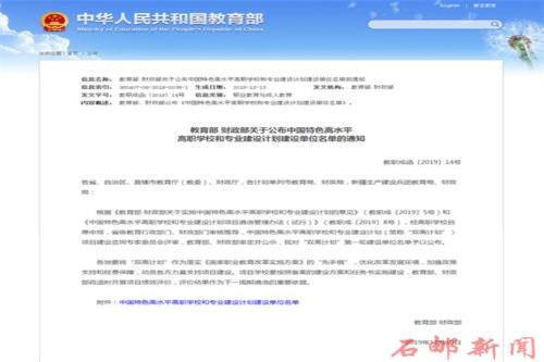 2019年12月13日,教育部网站公布了中国特色高水平高职学校和专业建设计划(简称“双高计划”)第一轮建设单位名单,学院榜上有名,成功入选高水平专业群建设单位。