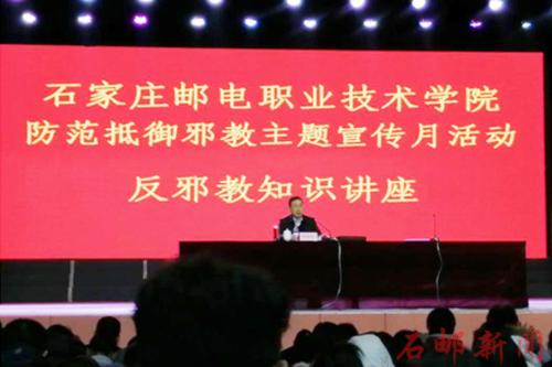 为进一步推动反邪教宣传警示教育向基层延申,扎实开展“2019年反邪教宣传月”主题活动,切实增强广大在校生识别邪教、自觉抵制邪教的能力,使大学生充分认识邪教活动的本质和危害,12月5日下午,学院反邪教协会邀请河北省反邪教协会副理事长兼秘书长刘国红同志为学院学生作了反邪教知识专题讲座。讲座在东西校区各举办一场,近2000学生聆听了讲座。