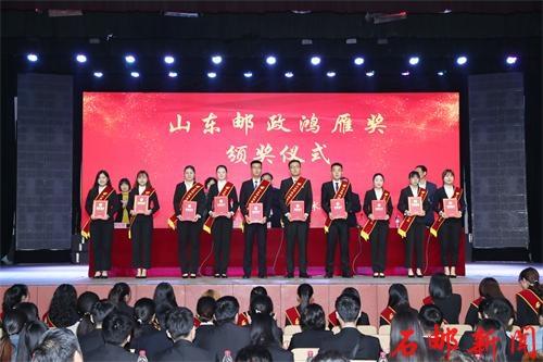 “山东邮政鸿雁奖”是山东省邮政公司专门为山东邮政订单生(学徒)设立的企业奖学金,对在校期间综合表现突出的学生予以奖励,分年级每学年评定一次,一、二、三等奖获得者分别奖励1500元、1200元、1000元不等。首次获奖的60名同学来自2016、2017、2018三个年级,包括一等奖15名、二等奖15名、三等奖30名。按照校企共同制定的企业奖学金评定办法,今后还将对进步显著的同学颁发“奋进奖”。