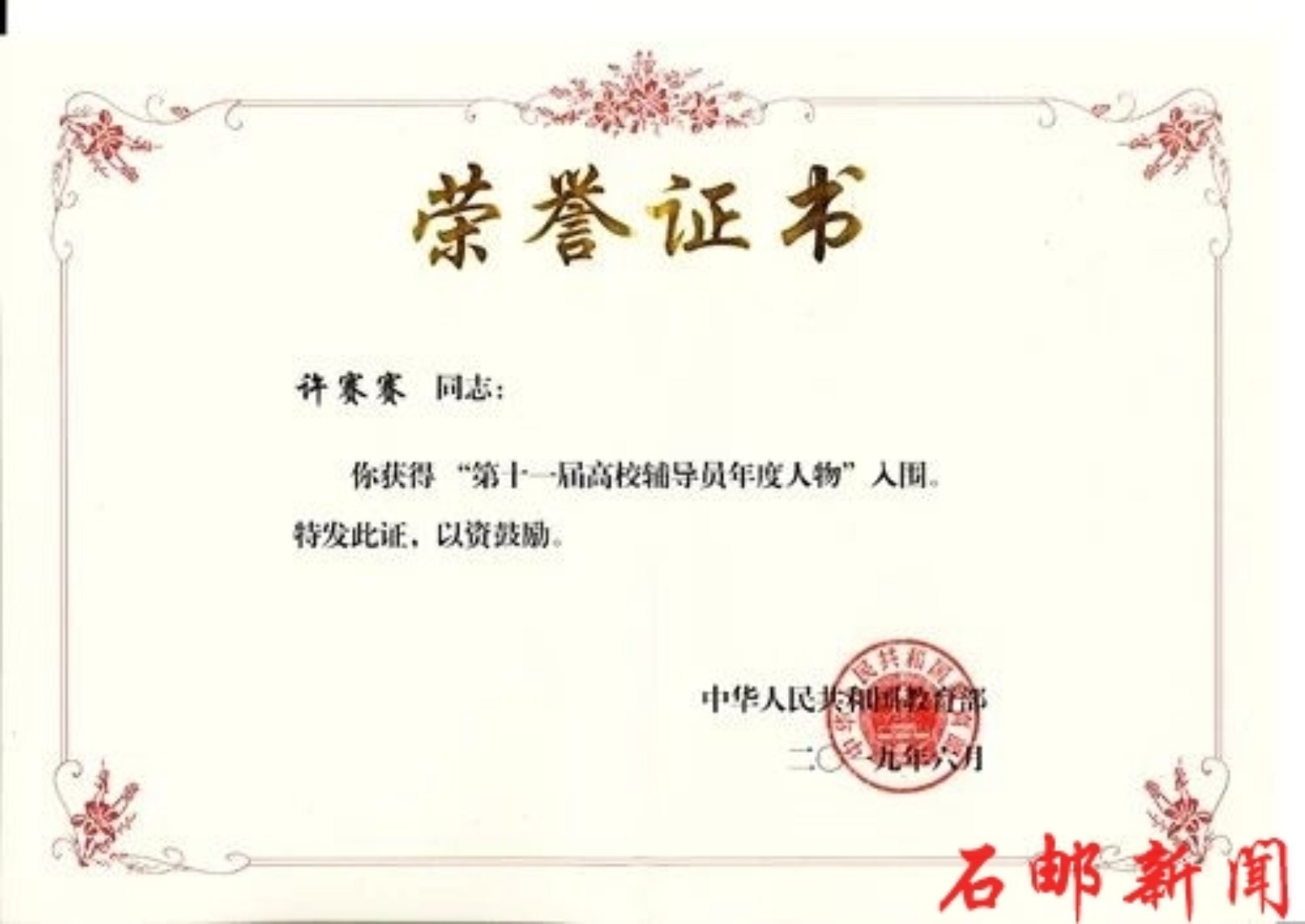 全国高校辅导员年度人物评选活动从2008年开始,迄今已举办了十一届,是规格最高、最具权威的辅导员工作业绩评比。此次评选旨在推动全国高校落实立德树人根本任务,培育践行社会主义核心价值观,大力培养选树新时代高校辅导员先进榜样,充分展示新时代高校辅导员群体昂扬向上的精神风貌。评选活动于4月份启动,经河北省教育厅专家评审,全省共推荐包括学院许赛赛老师在内的6名高校辅导员参加了全国的推选活动。经过通讯盲评、实地考察等环节,许赛赛老师最终获得全国“第十一届高校辅导员年度人物”入围奖。