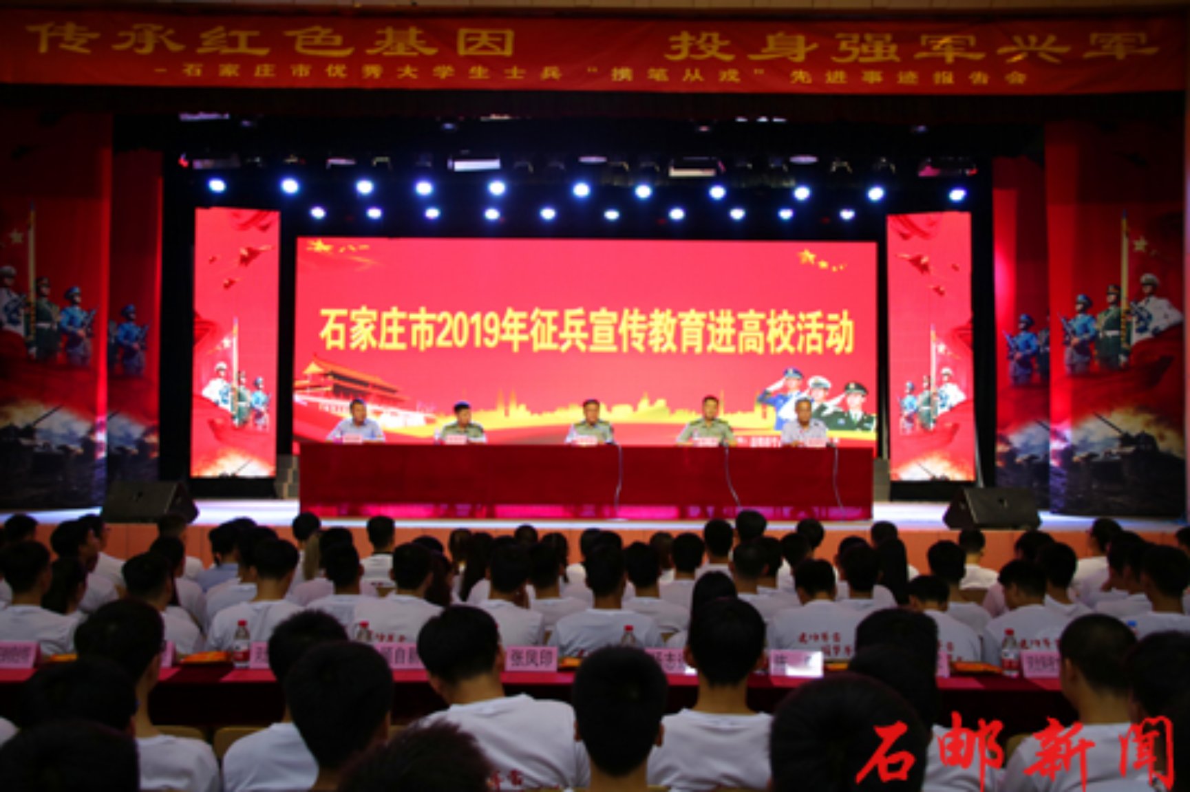 作为石家庄市2019年征兵宣传教育进高校活动,报告会由石家庄市警备区、裕华区武装部和学院联合举办。石家庄市警备区国防动员处处长杨志远,裕华区武装部部长陈勇、政委张凤印,学院学生处处长鲍增军、副处长顾自新出席了报告会。来自河北师范大学、河北科技大学、河北地质大学、河北化工医药职业技术学院、河北青年管理干部学院和学院的800余名大学生代表参加了报告会。