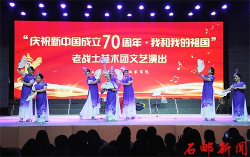 为庆祝新中国成立七十周年,2019年4月28日,由学院工会和学生处团委特邀石家庄老战士艺术团,在学院开展了“庆祝新中国成立七十周年――我和我的祖国”公益演出活动。学院千余师生观看了演出。