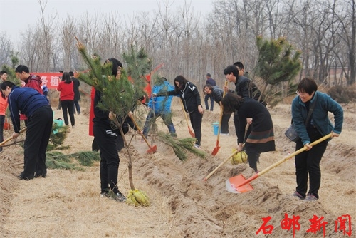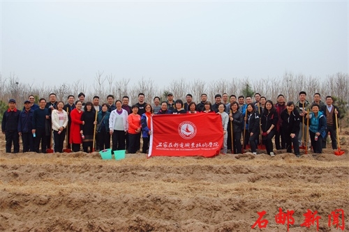 春分时节,乍暖还寒。来自各系、部、处、室的44名教职员工代表一早乘车抵达义务植树活动地点--鹿泉区小壁林场。学院纪委书记周雪峰同志做简短动员后,大家领取植树工具,在林场工作人员的指导下,马上投入植树活动。大家三人一组,分工合作,有的挖坑,有的拿树苗,有的踩土,现场气氛异常火热。经过近两个小时的紧张劳动,一行行小松树站立起来,整齐排列,展现着勃勃生机。大家看着自己种好的小树,忘却了疲惫,拍去身上尘土,擦去脸上汗水,露出了喜悦的笑容。