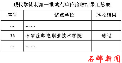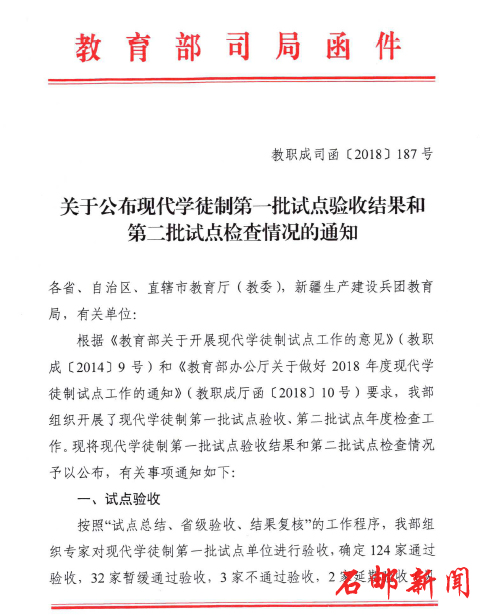 日前,教育部印发《关于公布现代学徒制第一批试点验收结果和第二批试点检查情况的通知》(教职成司函〔2018〕187号),公布了现代学徒制第一批试点验收结果,学院现代学徒制试点项目顺利通过教育部验收。
