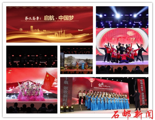 第三篇章“启航?中国梦”,舞蹈《燃烧我的卡路里》、器乐歌舞《鸿雁》、歌舞《不忘初心》、大合唱《劳动托起中国梦》《共筑中国梦》表达了学院教职员工在继续推进改革开放的征途中,不忘初心,且歌且行,携手“共筑中国梦”的决心和信心。
