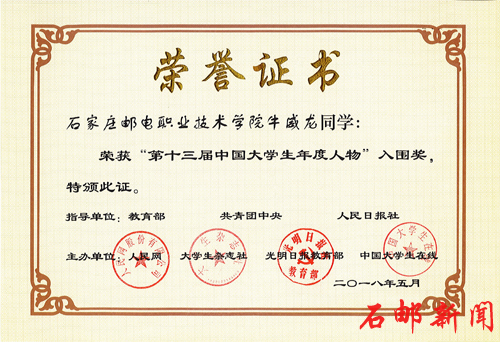 据了解,河北省高校仅有3名学生获评“第十三届中国大学生年度人物”入围奖,牛威龙同学是其中唯一一名专科学生。他的入选充分展示了学院的“两种素质、两种能力”培养成果,体现了学院的人才培养质量,提升了学院的知名度。