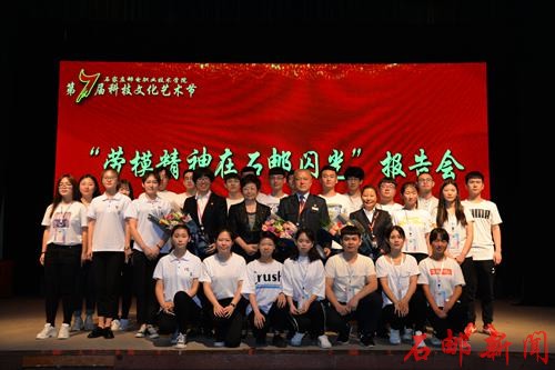 为弘扬邮政企业劳动模范爱岗敬业、争创一流,艰苦奋斗、勇于创新,淡泊名利、甘于奉献的精神,2018年5月7日,学院特别邀请了何健忠、尼玛拉木、郭恩娟等三位劳模兼职辅导员在东区礼堂举办了第七届科技文化艺术节之“劳模精神在石邮闪光”报告会。学院党委副书记、副院长周爱莲出席并主持了报告会,学生处、团委和各系的学生工作队伍,以及1000余名在校生聆听了报告。