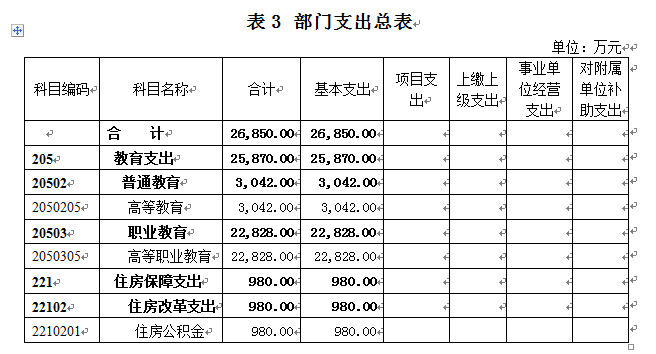 2018年学院支出总计26,850.00万元,全部为基本支出。其中:教育支出25,870.00万元,占96.35%;住房保障支出980万元,占3.65%。详细情况如下表: