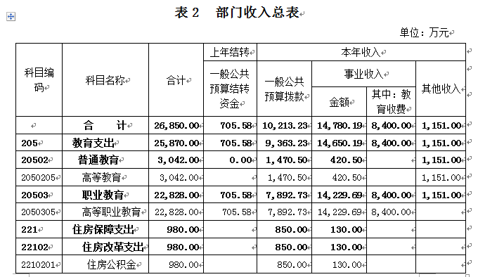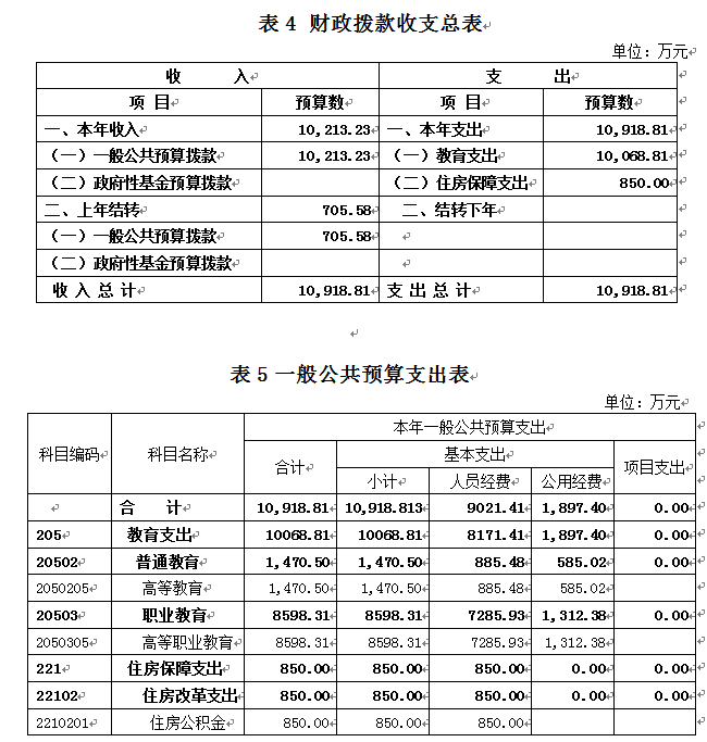 2018年财政拨款总收入10,918.81万元,含本年收入10,213.23万元,占93.54%;上年结转705.58万元,占6.46%。财政拨款支出10,918.81万元,全部安排为基本支出。其中:2050205高等教育支出1470.50万元(包括人员经费885.48万元、公用经费585.02万元),2050305高等职业教育支出8598.31万元(包括人员经费7285.93万元、公用经费1312.38万元),2210201住房公积金支出850.00万元,全部为人员经费。详细情况如下表:
