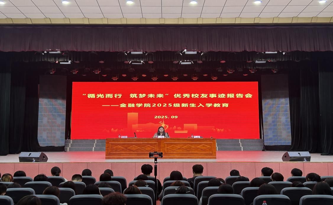 为助力金融学院2025级新生更快适应大学生活,明确学习目标和努力方向,树立对未来职业发展的信心,金融学院于2025年9月18日晚在西校区礼堂举办了“循光而行 筑梦未来”优秀校友事迹报告会,2025级全体新生到场聆听。