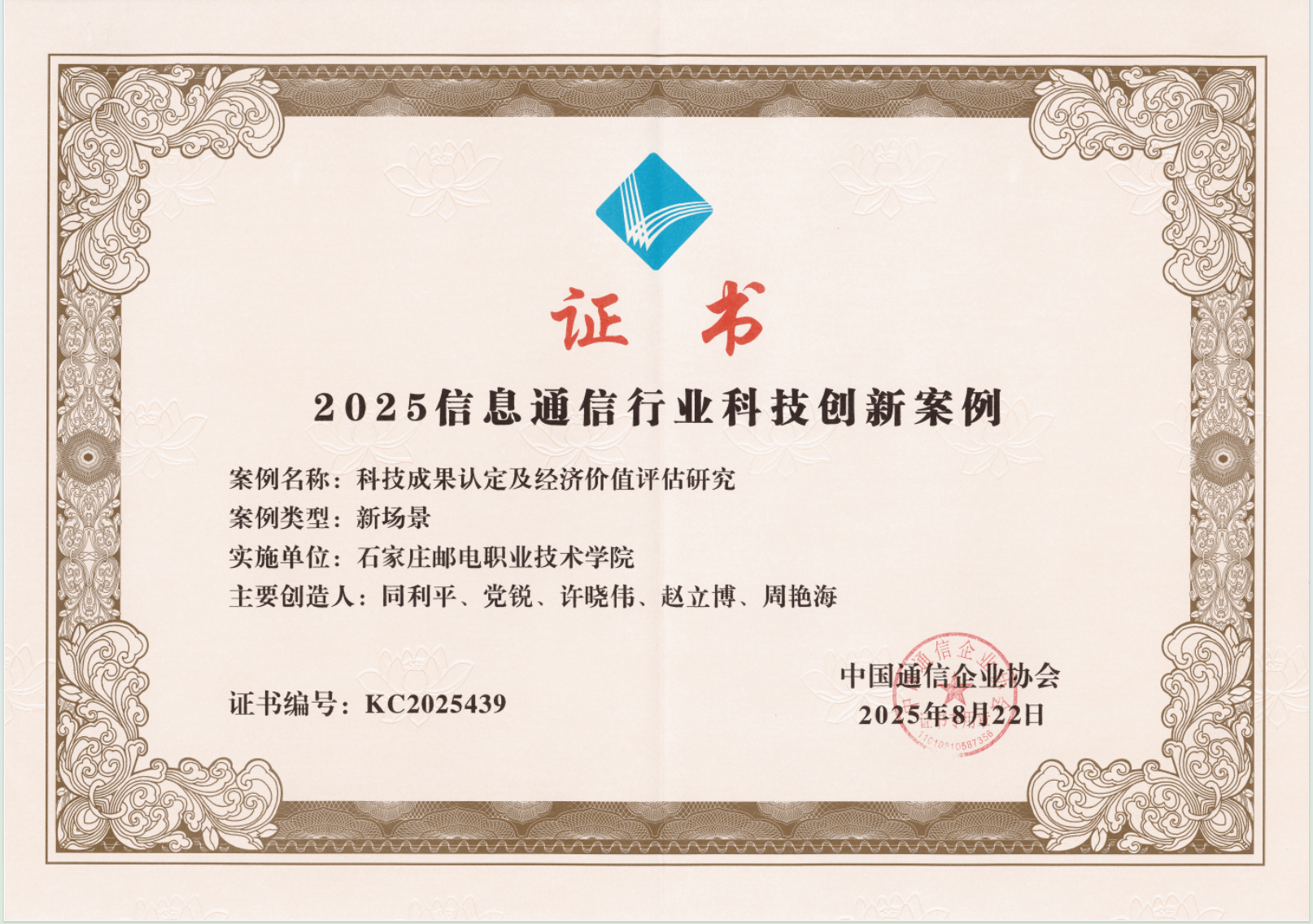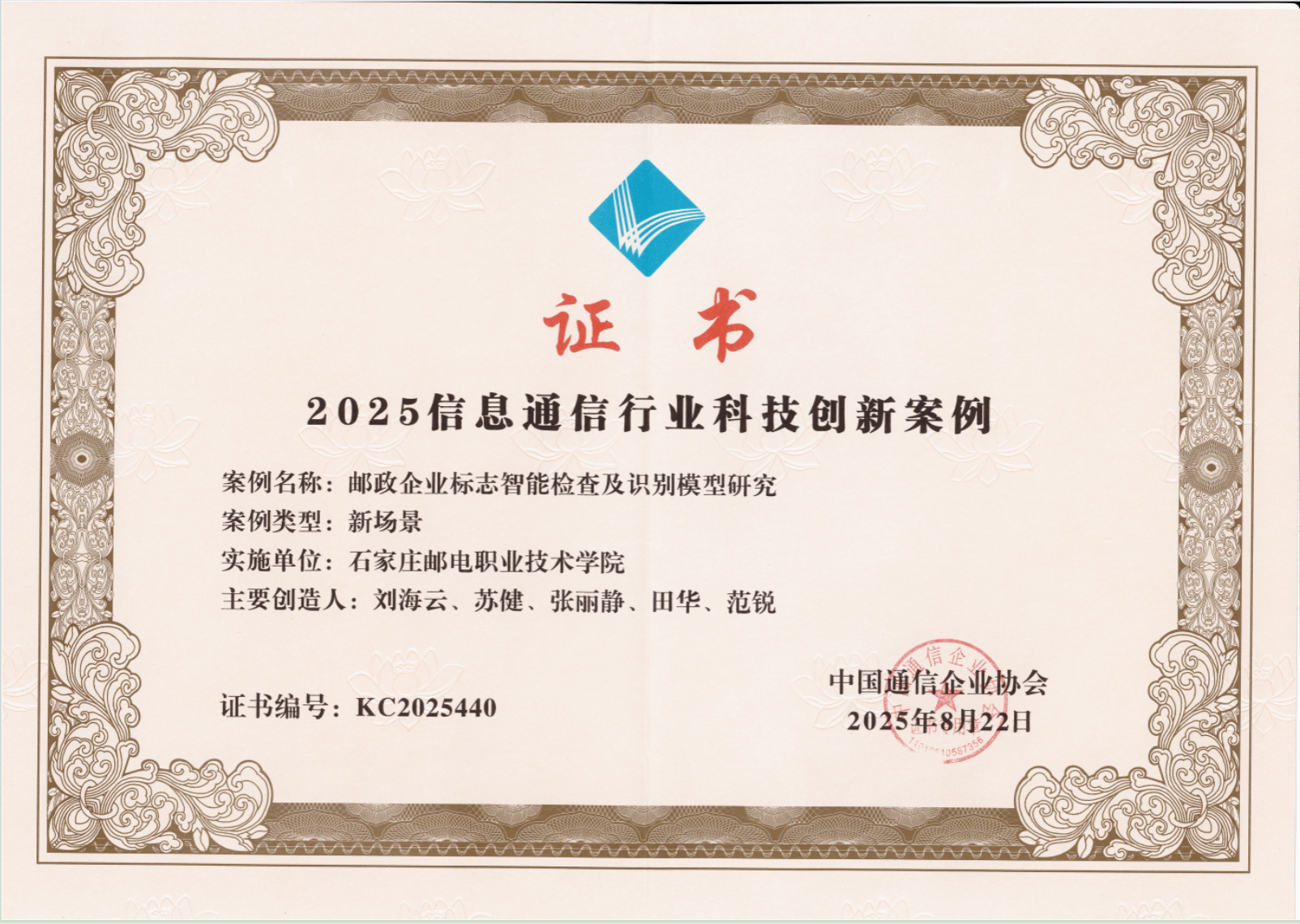 2025年6月中国通信企业协会组织开展了信息通信行业科技创新案例征集活动,学院同利平团队的科研成果《科技成果认定与经济价值评估研究》、刘海云团队的科研成果《邮政企业标志智能检查及识别模型研究》被中国邮政集团有限公司列入推荐案例并成功入选。