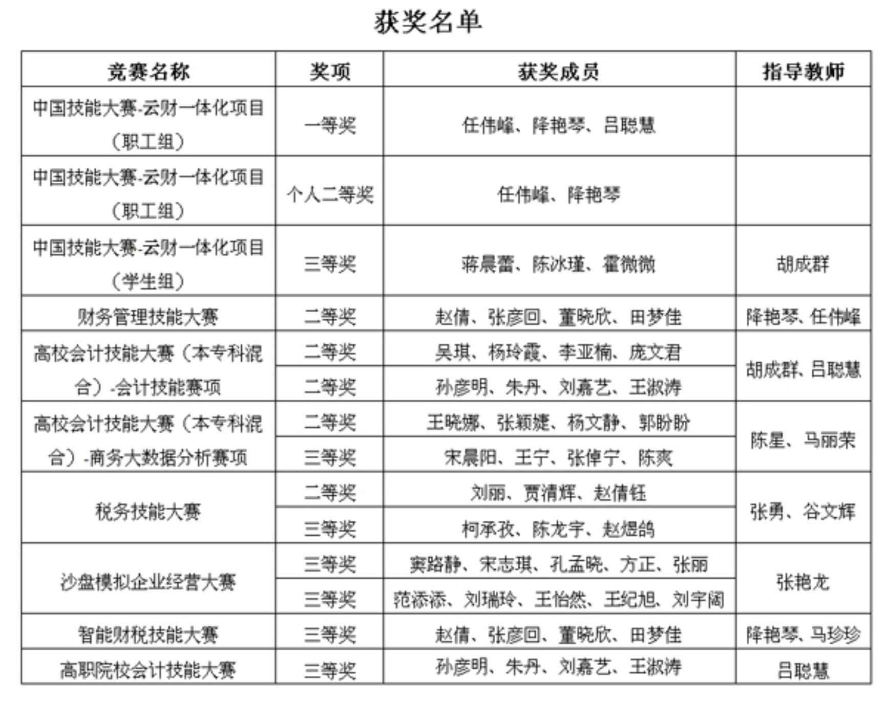 12月6日,河北省高等职业院校会计技能大赛落下帷幕,标志着由河北省教育厅主办的2020年河北省财会类职业技能系列赛事全部结束。学院会计系组织代表队参加了系列赛事,经过激烈角逐,共获得一等奖1项、二等奖5项、三等奖7项,有10位老师获得“优秀指导教师”称号,任伟峰、降艳琴两位老师获得“中国技能大赛-云财一体化项目(职工组)”个人二等奖。