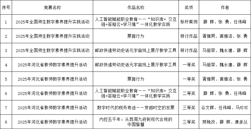 近日,由教育部教育技术与资源发展中心(中央电化教育馆)组织的”2025年全国师生数字素养提升实践活动”及河北省教育厅主办的“2025年河北省教师数字素养提升实践活动”结果陆续公布,会计学院教师团队表现优异,在省赛和国赛中接连斩获重要奖项,充分展示了我院在推进教育教学数字化转型、提升教师数字素养与创新能力方面的丰硕成果。