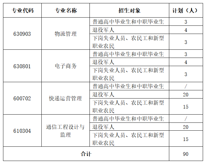 学院2019年安排4个专业参加高职专项扩招,招生计划总计90名,按照普通高中毕业生和中职毕业生,退役军人,下岗失业人员、农民工和新型职业农民,分开单列。其中面向退役军人的招生计划先在第一阶段安排招生,第二阶段招生计划根据2019年10月考生报名情况再行编制。具体招生计划详见下表: