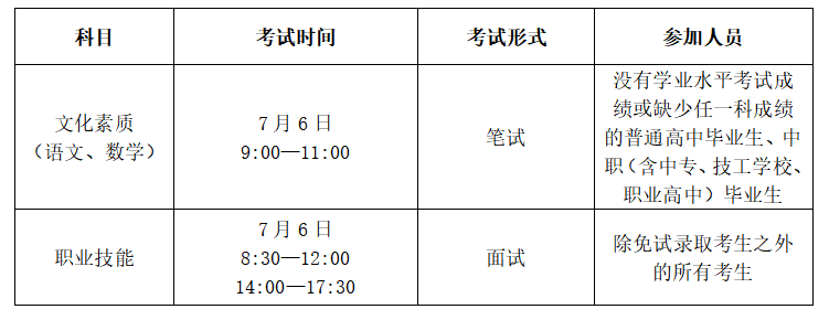 1.文化素质考试和职业技能测试均安排在7月6日进行,具体安排见下表: