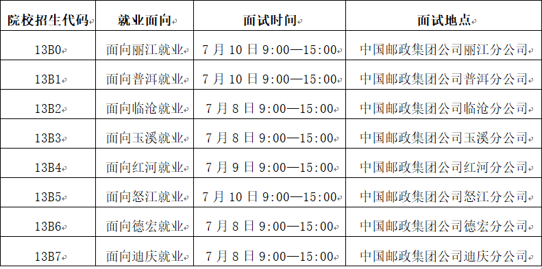 2.面试时间和地点。考生应到所填报志愿指向的就业面向地区参加面试,报考面向曲靖就业专业志愿的考生应就近选择到玉溪、红河或文山参加面试。面试时间及地点详见下表。