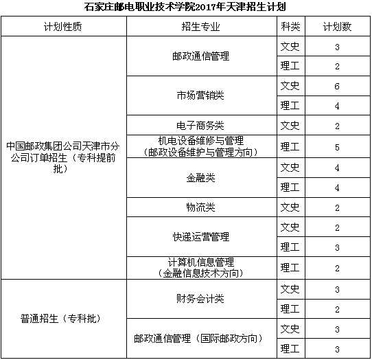 2017年学院在天津计划招生50名,其中为中国邮政集团公司天津市分公司招收“邮政公司订单生”39名,普通招生11名。考生自愿报考,学院按国家招生规定在面试合格考生中择优录取,录取的“订单生”入学后签订订单培养就业三方协议。学生毕业符合协议要求,企业直接安排就业。